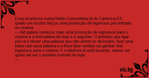 — Alô galera começou mais uma promoção de ingressos para o cinema e a brincadeira de hoje é o seguinte: O primeiro que ligar pra cá e disser uma palavra que não existe no dicionário, fizer uma frase com essa palavra e a frase fizer sentido vai ganhar dois ingressos para o cinema. E o telefone já está tocando, vamos ver quem vai ser o primeiro sortudo de hoje.
