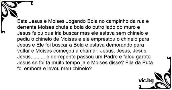 Esta Jesus e Moises Jogando Bola no campinho da rua e derrente Moises chuta a bola do outro lado do muro e Jesus falou que iria buscar mas ele estava sem chinelo e pediu o chinelo de Moises e ele emprestou o chinelo para Jesus e Ele foi buscar a Bola e estava demorando para voltar e Moises começou a chamar: Jesus, Jesus, Jesus, Jesus.......... e derrepente passou um Padre e falou garoto Jesus se foi fa muito tempo ja e Moises disse? Fila da Рuта foi embora e levou meu chinelo?