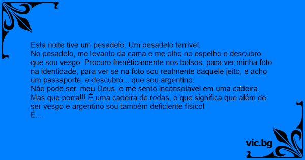 No pesadelo, me levanto da cama e me olho no espelho e descubro que sou vesgo. Procuro frenéticamente nos bolsos, para ver minha foto na identidade, para ver se na foto sou realmente daquele jeito, e acho um passaporte, e descubro... que sou argentino.