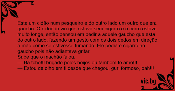 Esta um cidão num pesqueiro e do outro lado um outro que era gaucho. O cidadão viu que estava sem cigarro e o carro estava muito longe, então pensou em pedir a aquele gaucho que esta do outro lado, fazendo um gesto com os dois dedos em direção a mão como se estivesse fumando. Ele pedia o cigarro ao gaucho pois não adiantava gritar.