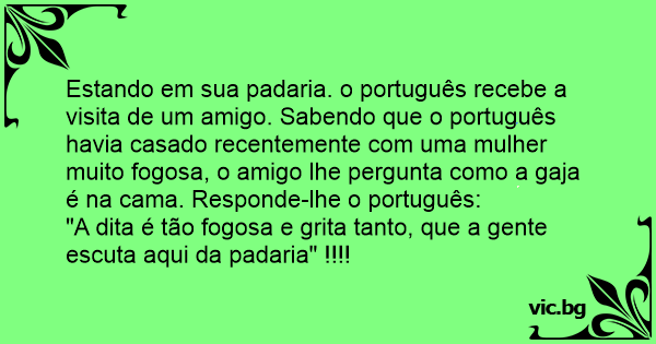 Estando em sua padaria. o português recebe a visita de um amigo. Sabendo que o português havia casado recentemente com uma mulher muito fogosa, o amigo lhe pergunta como a gaja é na cama. Responde-lhe o português: