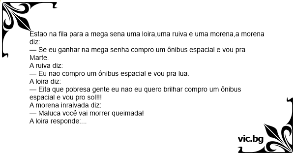 Estao na fila para a mega sena uma loira,uma ruiva e uma morena,a morena diz: