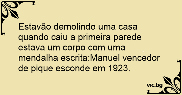 Estavão demolindo uma casa quando caiu a primeira parede estava um corpo com uma mendalha escrita:Manuel vencedor de pique esconde em 1923.