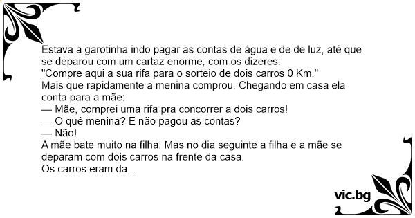 — Mãe, comprei uma rifa pra concorrer a dois carros!
