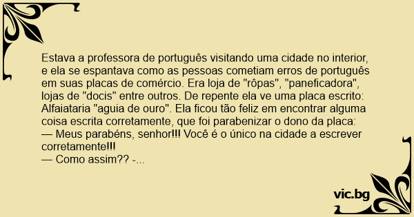 Estava a professora de português visitando uma cidade no interior, e ela se espantava como as pessoas cometiam erros de português em suas placas de comércio. Era loja de "rôpas", "paneficadora", lojas de "docis" entre outros. De repente ela ve uma placa escrito: Alfaiataria "aguia de ouro". Ela ficou tão feliz em encontrar alguma coisa escrita corretamente, que foi parabenizar o dono da placa: