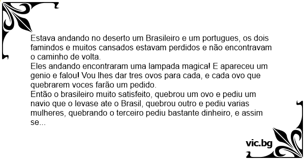 Estava andando no deserto um Brasileiro e um portugues, os dois famindos e muitos cansados estavam perdidos e não encontravam o caminho de volta.