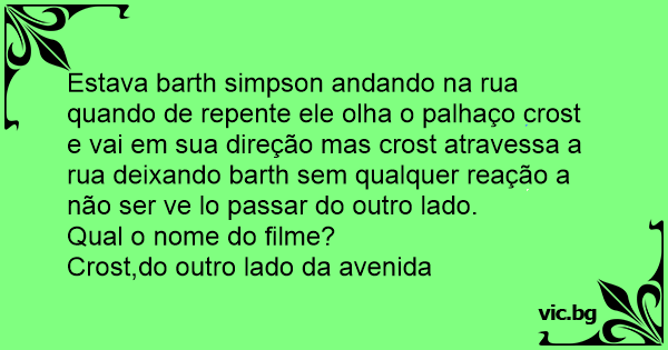 Estava barth simpson andando na rua quando de repente ele olha o palhaço crost e vai em sua direção mas crost atravessa a rua deixando barth sem qualquer reação a não ser ve lo passar do outro lado.