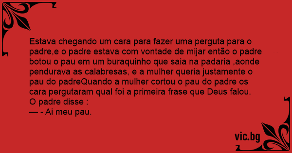 Estava chegando um cara para fazer uma perguta para o padre,e o padre estava com vontade de mijar então o padre botou o раu em um buraquinho que saia na padaria ,aonde pendurava as calabresas, e a mulher queria justamente o раu do padreQuando a mulher cortou o раu do padre os cara pergutaram qual foi a primeira frase que Deus falou.
