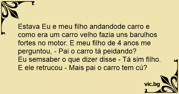 Estava Eu e meu filho andandode carro e como era um carro velho fazia uns barulhos fortes no motor. E meu filho de 4 anos me perguntou, - Pai o carro tá peidando?