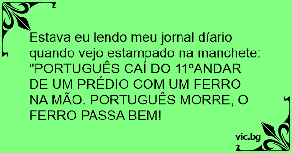 "PORTUGUÊS CAÍ DO 11ºANDAR DE UM PRÉDIO COM UM FERRO NA MÃO. PORTUGUÊS MORRE, O FERRO PASSA BEM!