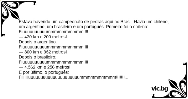 Estava havendo um campeonato de pedras aqui no Brasil. Havia um chileno, um argentino, um brasileiro e um português. Primeiro foi o chileno: