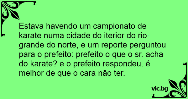 Estava havendo um campionato de karate numa cidade do iterior do rio grande do norte, e um reporte perguntou para o prefeito: prefeito o que o sr. acha do karate? e o prefeito respondeu. é melhor de que o cara não ter.