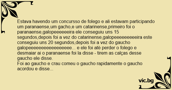 Estava havendo um concursso de folego e ali estavam participando um paranaense,um gacho,e um catarinense,primeiro foi o paranaense,galopeeeeeeira ele conseguiu uns 15 segundos,depois foi a vez do catarinense,galopeeeeeeeeeira este conseguiu uns 20 segundos,depois foi a vez do gaucho galopeeeeeeeeeeeeeeeee... e ele foi atè perder o folego e desmaiar ai o paranaense foi la disse - tirem as calças desse gaucho ele disse.