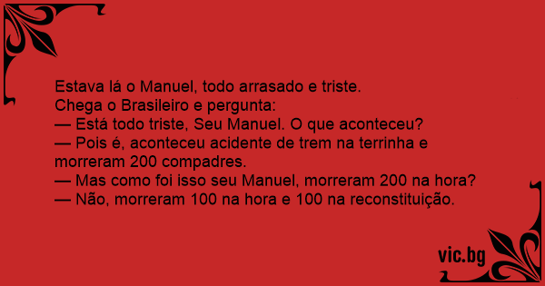 — Pois é, aconteceu acidente de trem na terrinha e morreram 200 compadres.