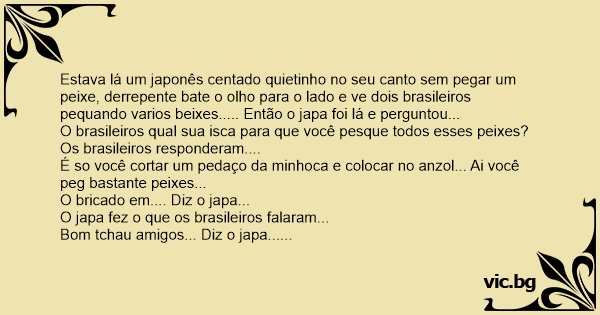 Estava lá um japonês centado quietinho no seu canto sem pegar um peixe, derrepente bate o olho para o lado e ve dois brasileiros pequando varios beixes..... Então o japa foi lá e perguntou...