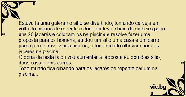 Estava lá uma galera no sitio se divertindo, tomando cerveja em volta da piscina de repente o dono da festa cheio do dinheiro pega uns 20 jacarés e colocam-os na piscina e resolve fazer uma proposta para os homens, eu dou um sitio,uma casa e um carro para quem atravessar a piscina, e todo mundo olhavam para os jacarés na piscina.