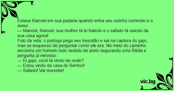 Estava Manoel em sua padaria quando entra seu vizinho correndo e o avisa: