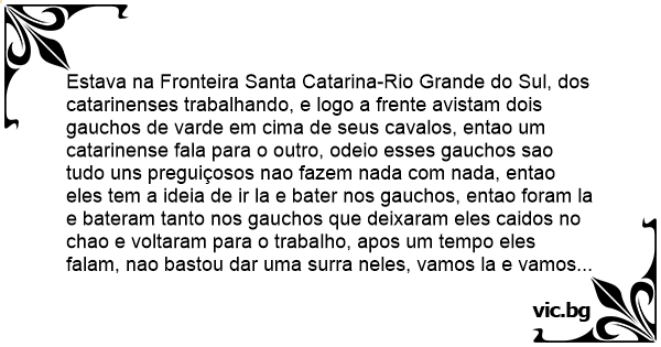 Estava na Fronteira Santa Catarina-Rio Grande do Sul, dos catarinenses trabalhando, e logo a frente avistam dois gauchos de varde em cima de seus cavalos, entao um catarinense fala para o outro, odeio esses gauchos sao tudo uns preguiçosos nao fazem nada com nada, entao eles tem a ideia de ir la e bater nos gauchos, entao foram la e bateram tanto nos gauchos que deixaram eles caidos no chao e voltaram para o trabalho, apos um tempo eles falam, nao bastou dar uma surra neles, vamos la e vamos comer o cuzinho deles, entao foram la comeram o cuzinho dos gauchos ate gozarem e voltaram trabalhar, E um vira para o outro e diz: