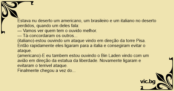 Estava nu deserto um americano, um brasileiro e um italiano no deserto perdidos, quando um deles fala: