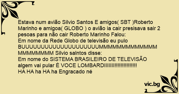 Estava num avião Silvio Santos E amigos( SBT )Roberto Marinho e amigoa( GLOBO ) o avião ia cair presisava sair 2 pesoas para não cair Roberto Marinho Falou: