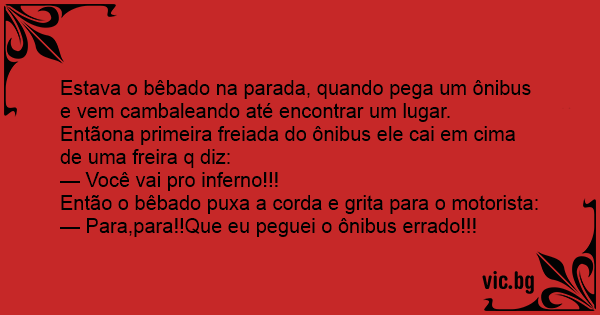 Estava o bêbado na parada, quando pega um ônibus e vem cambaleando até encontrar um lugar.