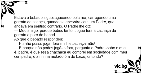 Estava o bebado ziguezagueando pela rua, carregando uma garrafa de cahaça, quando se encontra com um Padre, que andava em sentido contrário. O Padre lhe diz: