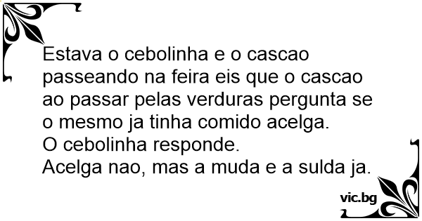 Estava o cebolinha e o cascao passeando na feira eis que o cascao ao passar pelas verduras pergunta se o mesmo ja tinha comido acelga.