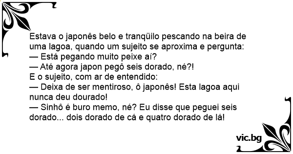 — Deixa de ser mentiroso, ô japonês! Esta lagoa aqui nunca deu dourado!