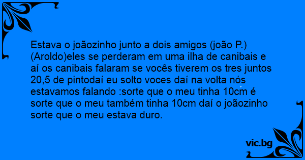 Estava o joãozinho junto a dois amigos (joão P.)(Aroldo)eles se perderam em uma ilha de canibais e aí os canibais falaram se vocês tiverem os tres juntos 20,5 de pintodaí eu solto voces daí na volta nós estavamos falando :sorte que o meu tinha 10cm é sorte que o meu também tinha 10cm daí o joãozinho sorte que o meu estava durо.