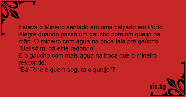 Estava o Mineiro sentado em uma calçado em Porto Alegre quando passa um gaúcho com um queijo na mão. O mineiro com água na boca fala pro gaúcho: