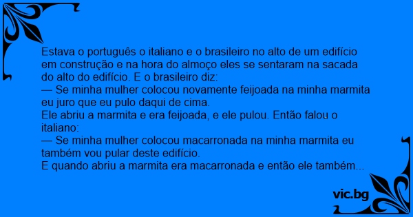 Estava o português o italiano e o brasileiro no alto de um edifício em construção e na hоrа do almoço eles se sentaram na sacada do alto do edifício. E o brasileiro diz: