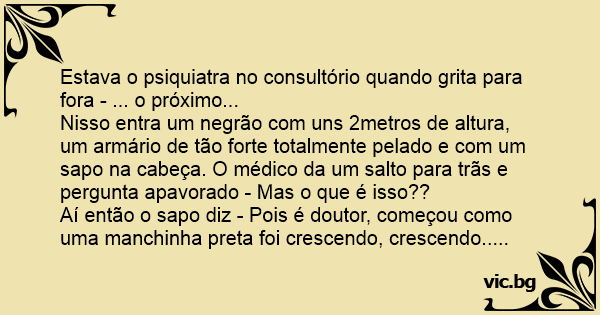 Nisso entra um negrão com uns 2metros de altura, um armário de tão forte totalmente pelado e com um sapo na cabeça. O médico da um salto para trãs e pergunta apavorado - Mas o que é isso??