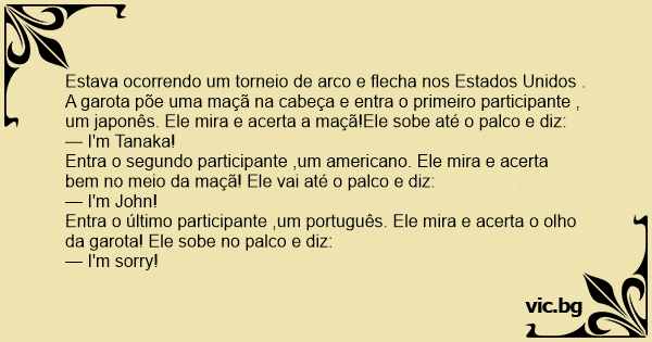 Entra o último participante ,um português. Ele mira e acerta o olho da garota! Ele sobe no palco e diz: