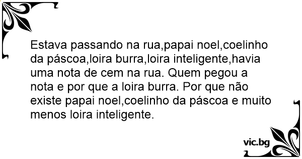 Estava passando na rua,papai noel,coelinho da páscoa,loira burra,loira inteligente,havia uma nota de cem na rua. Quem pegou a nota e por que a loira burra. Por que não existe papai noel,coelinho da páscoa e muito menos loira inteligente.
