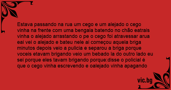 Estava passando na rua um cego e um alejado o cego vinha na frente com uma bengala batendo no chão eatrais vinha o alejado arrastando o pe o cego foi atravessar arua eai vei o alejado e bateu nele ai começou aquela briga minutos depois veio a pulicia e separou a briga porque voceis etavam brigando veio um bebado la do outro lado eu sei porque eles tavam brigando porque:disse o policial é que o cego vinha escrevendo e oalejado vinha apagando