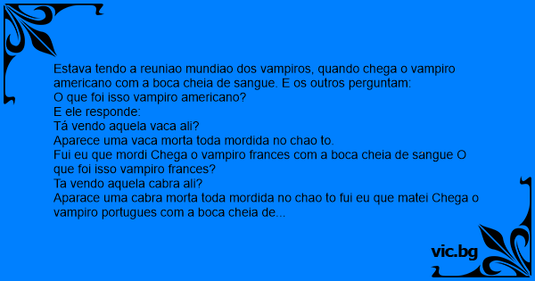 Estava tendo a reuniao mundiao dos vampiros, quando chega o vampiro americano com a boca cheia de sangue. E os outros perguntam: