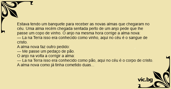 Estava tendo um banquete para receber as novas almas que chegaram no céu. Uma alma recém chegada sentada perto de um anjo pede que lhe passe um copo de vinho. O anjo na mesma hоrа corrige a alma nova: