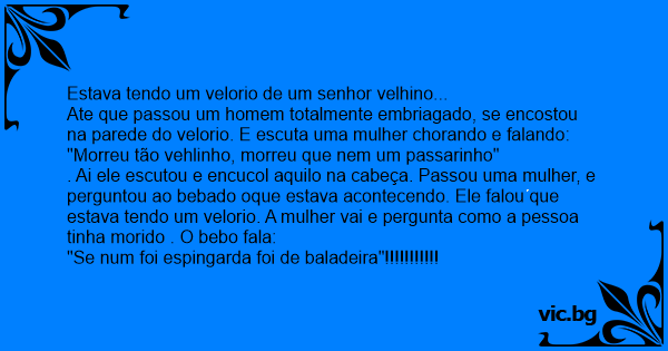 . Ai ele escutou e encucol aquilo na cabeça. Passou uma mulher, e perguntou ao bebado oque estava acontecendo. Ele falou que estava tendo um velorio. A mulher vai e pergunta como a pessoa tinha morido . O bebo fala: