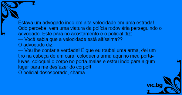 Estava um advogado indo em alta velocidade em uma estrada! Qdo percebe, vem uma viatura da polícia rodoviária perseguindo o advogado. Este pára no acostamento e o policial diz: