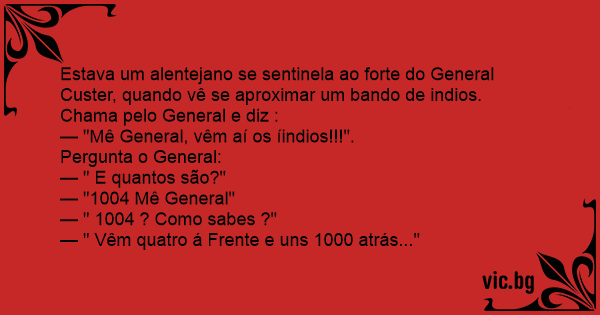 Estava um alentejano se sentinela ao forte do General Custer, quando vê se aproximar um bando de indios. Chama pelo General e diz :