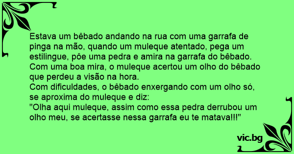Estava um bêbado andando na rua com uma garrafa de pinga na mão, quando um muleque atentado, pega um estilingue, pôe uma pedra e amira na garrafa do bêbado. Com uma boa mira, o muleque acertou um olho do bêbado que perdeu a visão na hоrа.