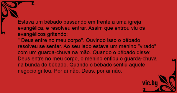 " Deus entre no meu corpo". Ouvindo isso o bêbado resolveu se sentar. Ao seu lado estava um menino "virado" com um guarda-chuva na mão. Quando o bêbado disse: Deus entre no meu corpo, o menino enfiou o guarda-chuva na bunda do bêbado. Quando o bêbado sentiu aquele negócio gritou: Por aí não, Deus, por aí não.