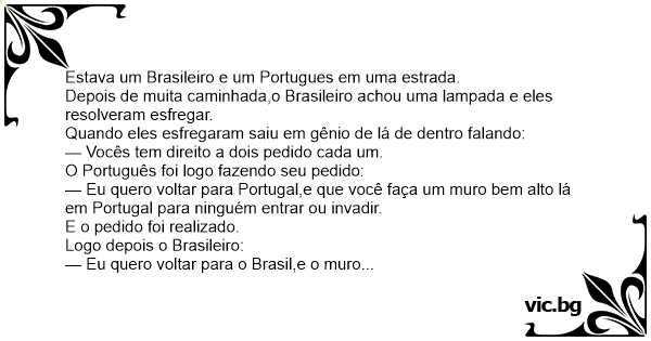 — Eu quero voltar para o Brasil,e o muro lá de Portugal é bem alto?ele perguntou para o gênio.