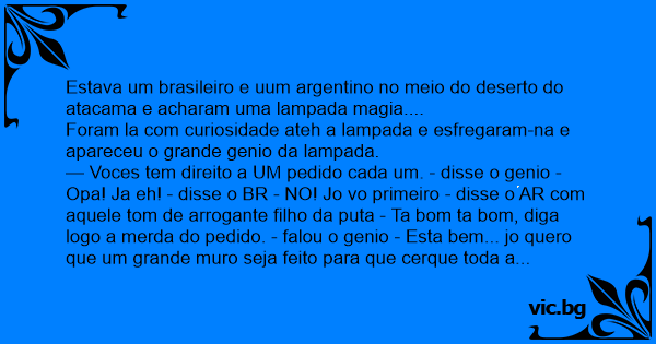 — Voces tem direito a UM pedido cada um. - disse o genio - Opa! Ja eh! - disse o BR - NO! Jo vo primeiro - disse o AR com aquele tom de arrogante filho da рuта - Ta bom ta bom, diga logo a меrdа do pedido. - falou o genio - Esta bem... jo quero que um grande muro seja feito para que cerque toda a argentina por todos os lados, ateh as maiores montanhas da grande argentina para jo ficar longe desses pe rapados - concluiu apontando para o brasileiro - Pedido feito, agora sai daqui, sua vez brasileiro.