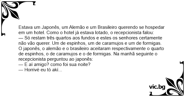 O japonês, o alemão e o brasileiro aceitaram respectivamente o quarto de espinhos, o de caramujos e o de formigas. Na manhã seguinte o recepcionista perguntou ao japonês: