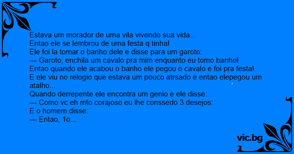 — Entao, 1o eu quero ter um rosto de galã de novela, 2o desejo ter um bolso cheio da grana e 3o quero ter um pinto que nem desse cavalo!