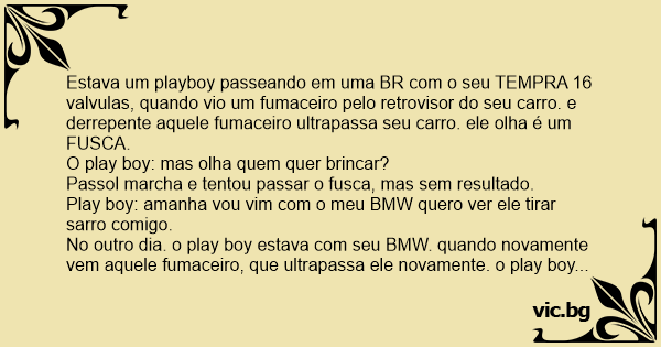 Estava um рlаyвоy passeando em uma BR com o seu TEMPRA 16 valvulas, quando vio um fumaceiro pelo retrovisor do seu carro. e derrepente aquele fumaceiro ultrapassa seu carro. ele olha é um FUSCA.