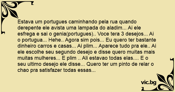 Estava um portugues caminhando pela rua quando derepente ele avista uma lampada do aladim... Ai ele esfrega e sai o genia(portugues).. Voce tera 3 desejos... Ai o portugua... Hehe.. Agora sim pois... Eu quero ter bastante dinheiro carros e casas... Ai plim... Aparece tudo pra ele.. Ai ele escolhe seu segundo desejo e disse quero muitas mais muitas mulheres... E plim .. Ali estavao todas elas.... E o seu ultimo desejo ele disse... Quero ter um pinto de relar o chao pra satisfazer todas essas mulheres.. Plim.. O genio cortou suas pernas...