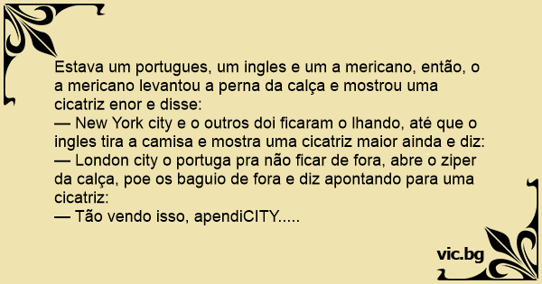 Estava um portugues, um ingles e um a mericano, então, o a mericano levantou a perna da calça e mostrou uma cicatriz enor e disse: