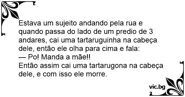 Estava um sujeito andando pela rua e quando passa do lado de um predio de 3 andares, cai uma tartaruguinha na cabeça dele, então ele olha para cima e fala: